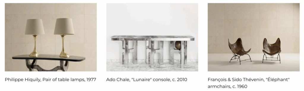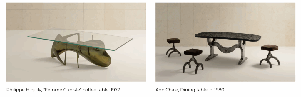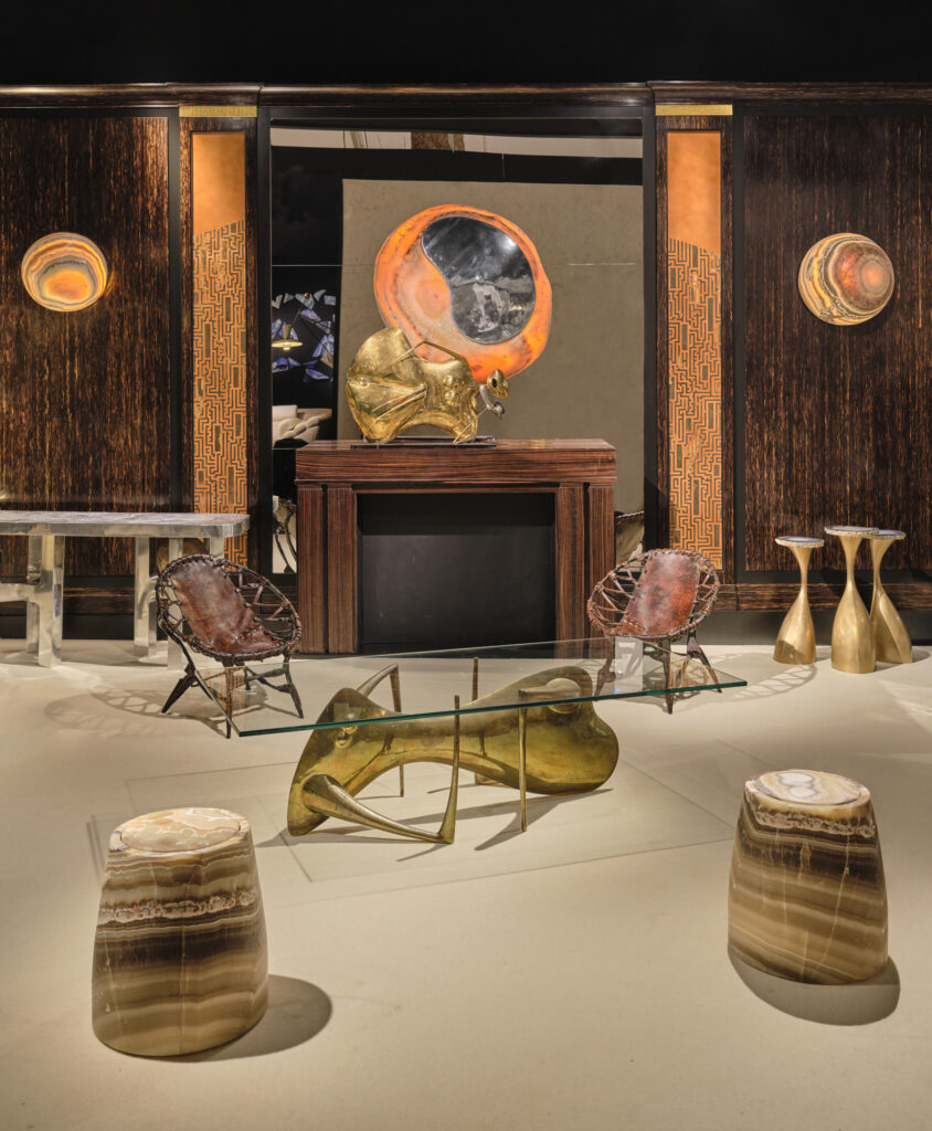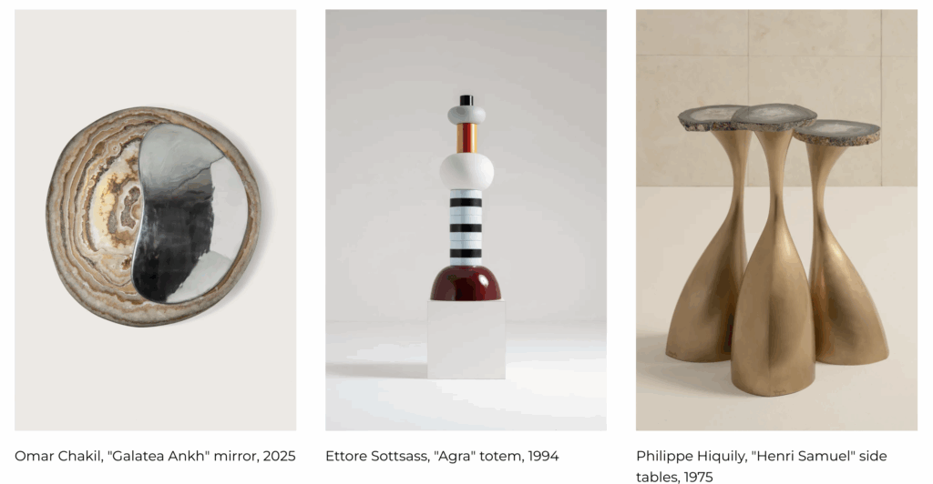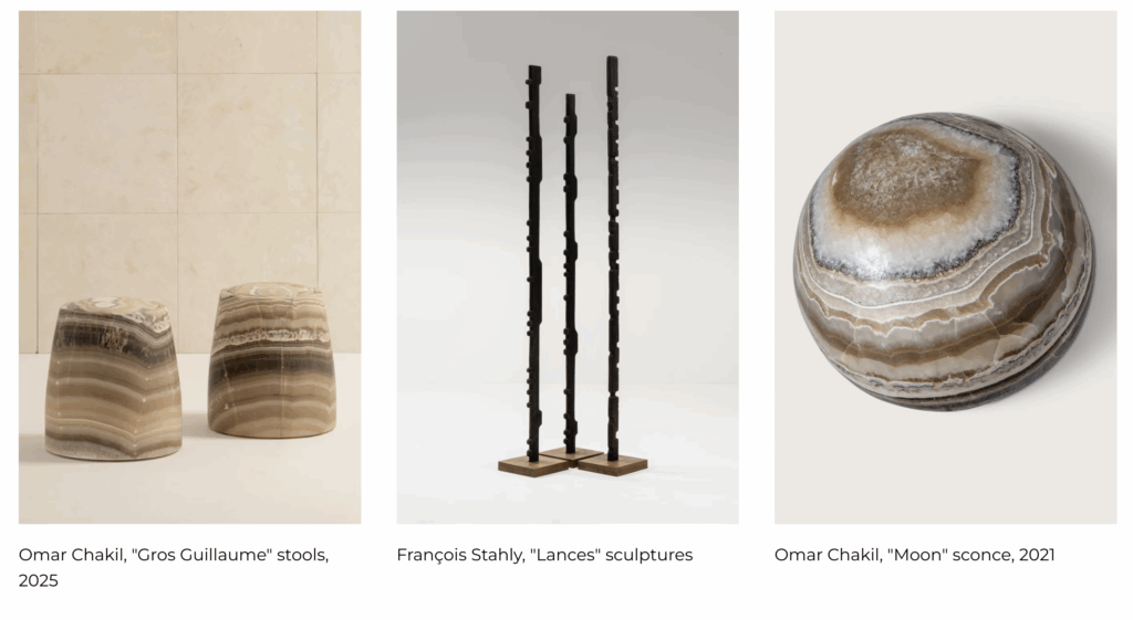 For the first time, a coffee table by Philippe Hiquily will be on display, accompanied by a dining room set by Ado Chale (1980s). Echoing these historic pieces, Emmanuel Jonckers will present his “Royale” table in aeronautical metal and nickel silver, while Omar Chakil will unveil for the first time a series of monumental mirrors in alabaster and steel, designed especially for the event.