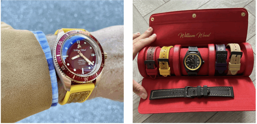 - Bracelet finish : The entire range of watch bracelets has a lug width of 20 mm, which fits all watch collections. The fire hose and firefighter equipment straps feature a silicone back stamped with “made from recovered materials” and “William Wood.” All straps are equipped with quick-release levers that allow you to add and remove any of the straps in seconds without the need for additional tools.