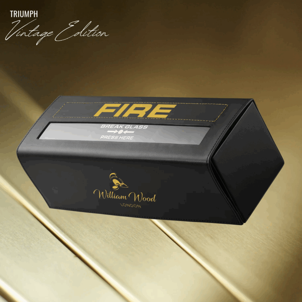 Each Vintage Triumph is beautifully presented in a genuine black and gold Italian leather fire alarm box, reinforcing the brand’s commitment to craftsmanship and symbolism.