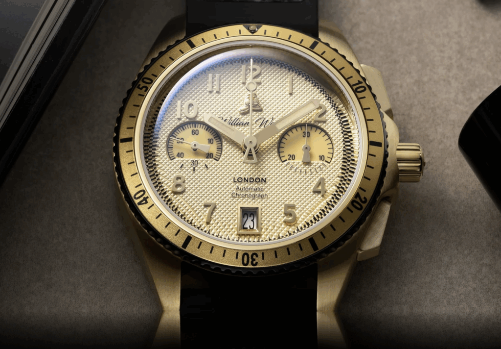 - Dial : Vintage champagne gold finish with cut-out hour markers and subdials at 3 o’clock and 9 o’clock. The disc at 3 o’clock measures the start/stop of the chronograph operated by the brass buttons, while the disc at 9 o’clock corresponds to the seconds hand. A date window at 6 o’clock is operated by the watch crown. The dial and hands are curved, creating a subtle optical illusion when viewed through the glass. Beneath the dial is a vintage Super-LumiNova disc that matches the dial. The numbered hour markers and hands are finished with a gold polish, as befits a vintage watch.